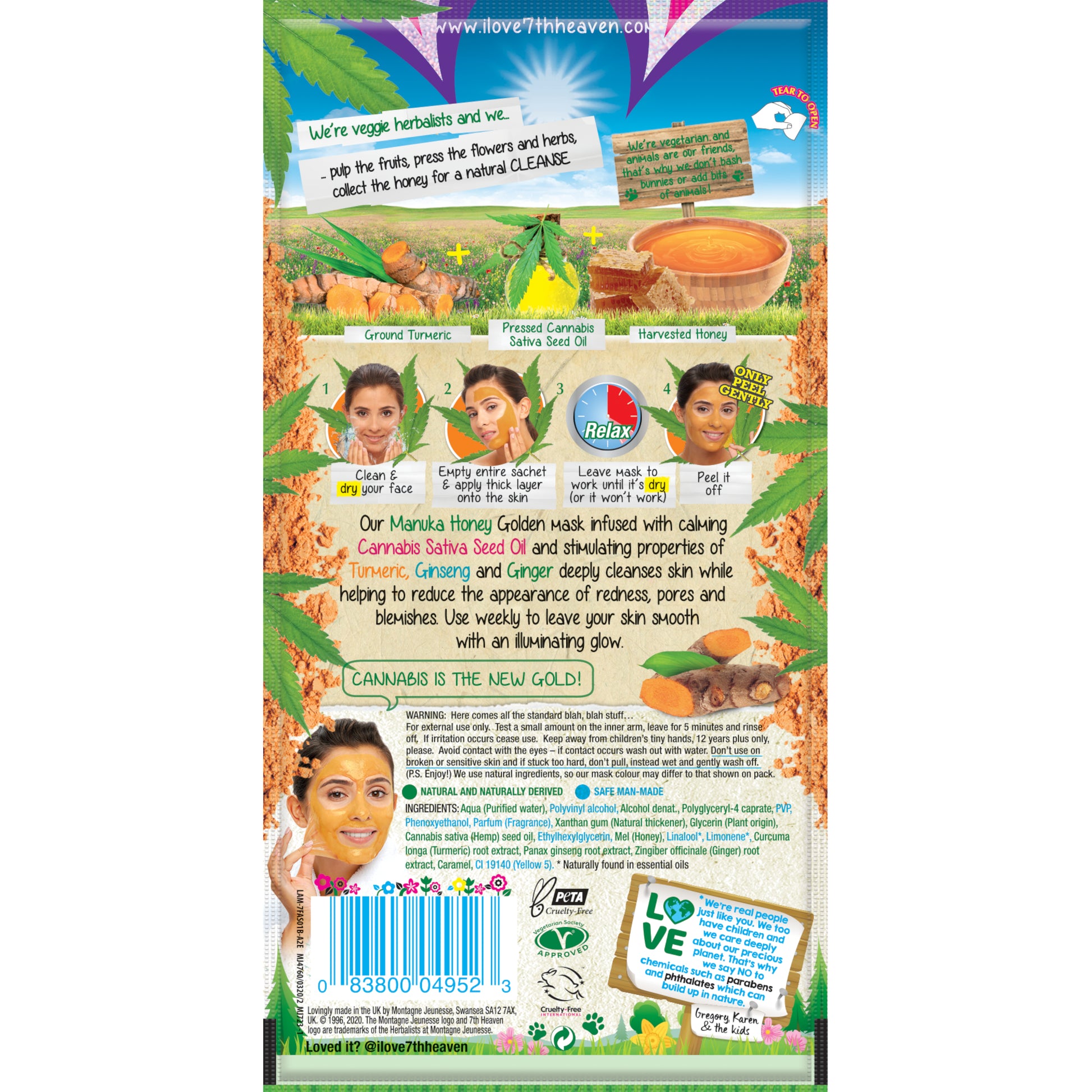 A nossa Máscara de Mel Dourado de Manuka, infundida com óleo de semente de Cannabis Sativa calmante e propriedades estimulantes do Cúrcuma, Giseng e Gengibre.