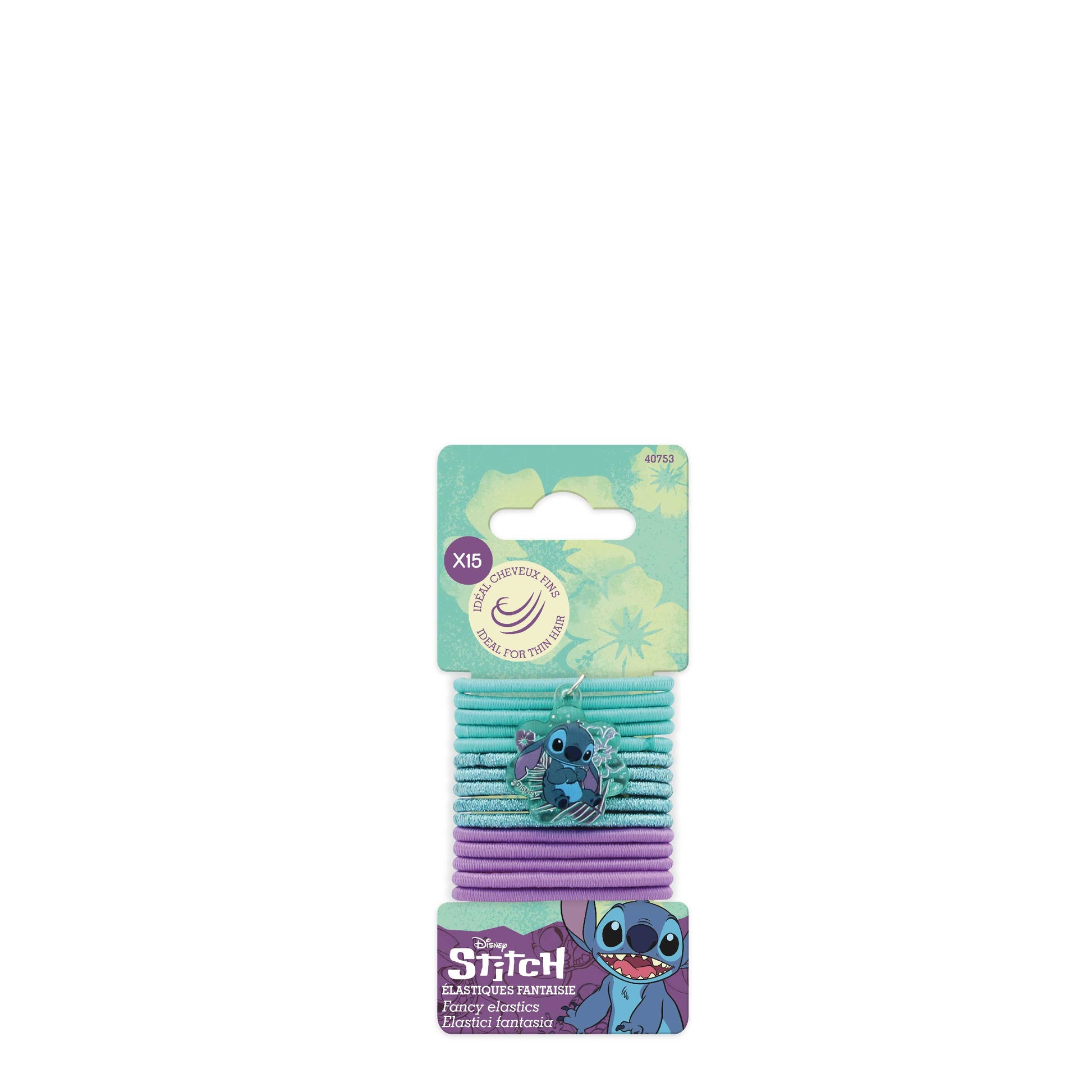 Conjunto de elásticos finos com glitter e um delicado charme Stitch. Perfeitos para cabelos finos, garantem uma fixação leve e cheia de estilo.