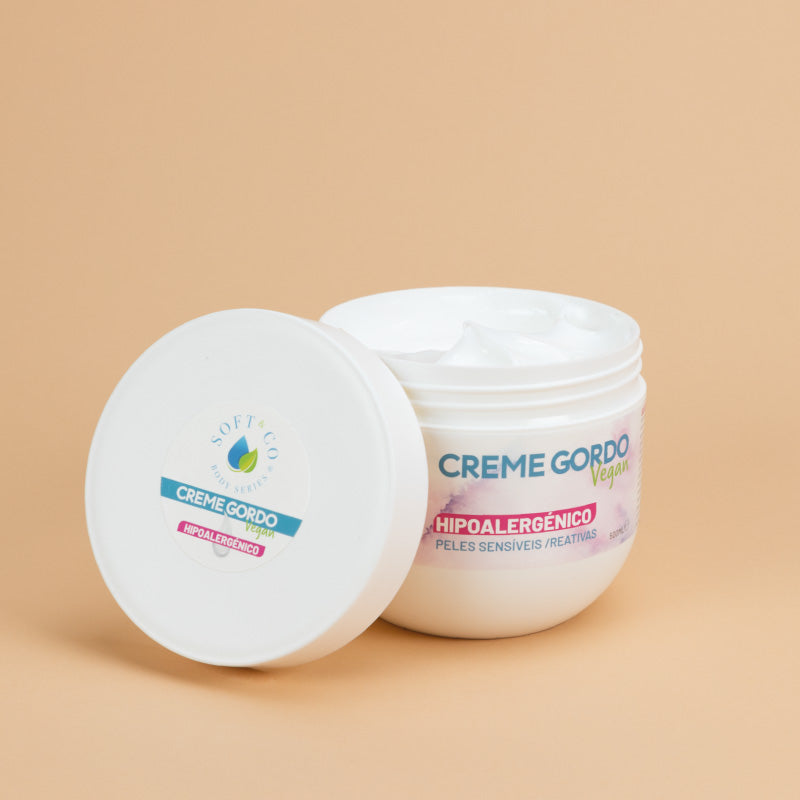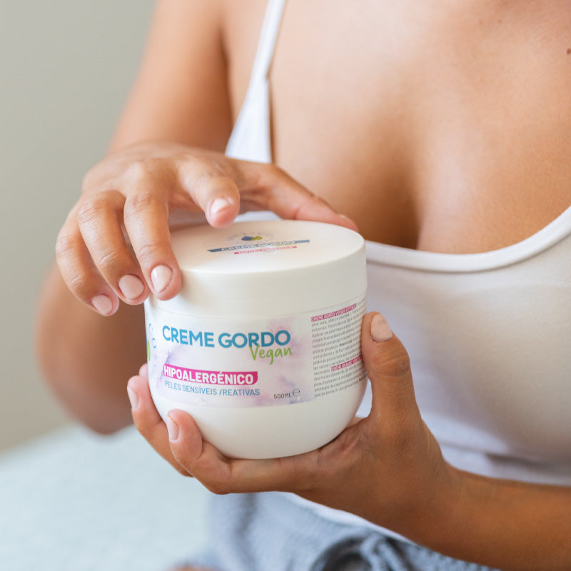 O creme gordo vegan Hipoalergénico protege a pele da secura extrema causada por agentes externos (frio, vento, detergentes, etc.).